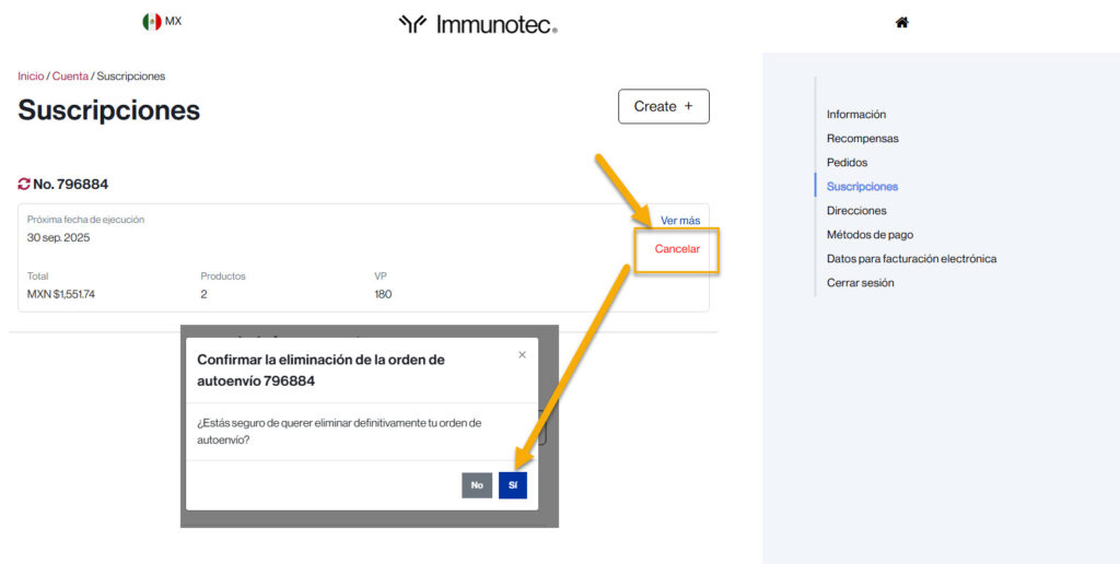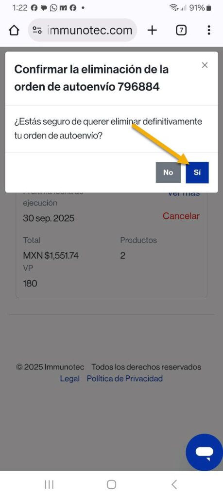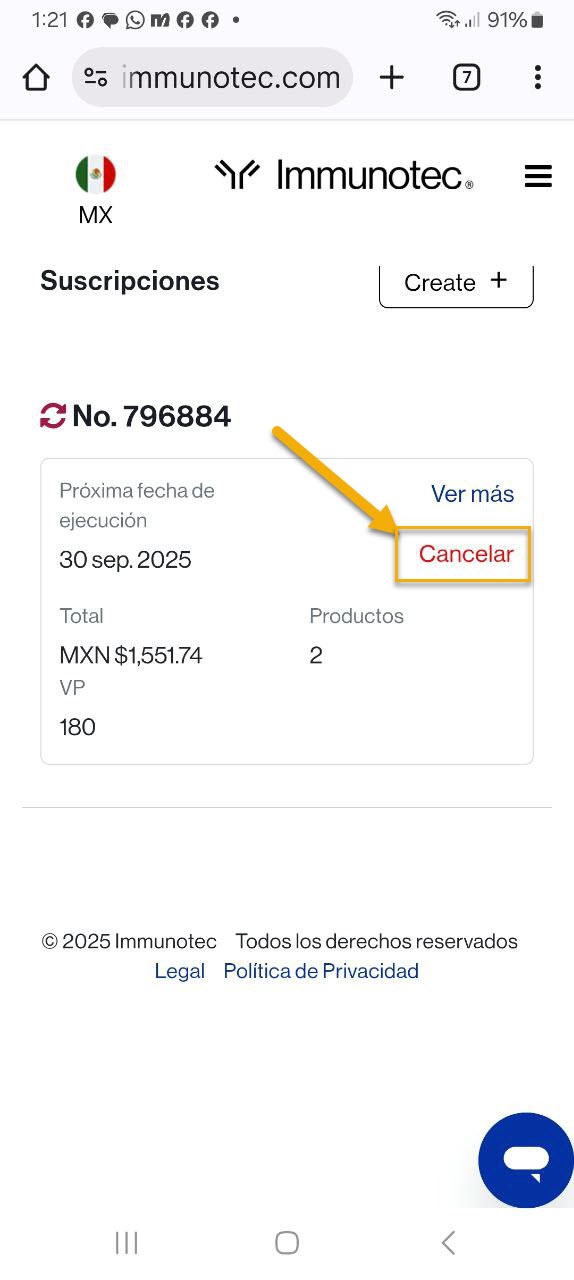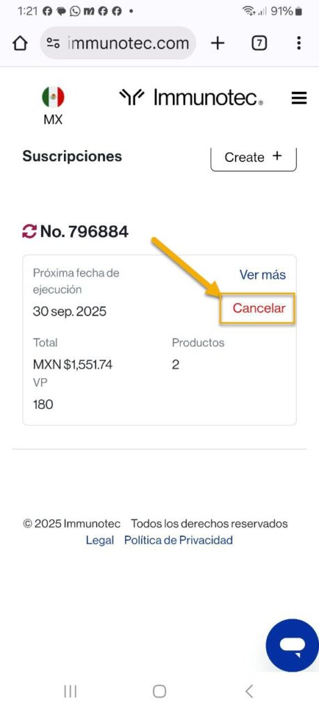 Si tienes suscripciones activas, verás la lista y a la derecha la opción Cancelar. Toca esa opción para proceder a cancelar el próximo autoenvío de casda suscripción.